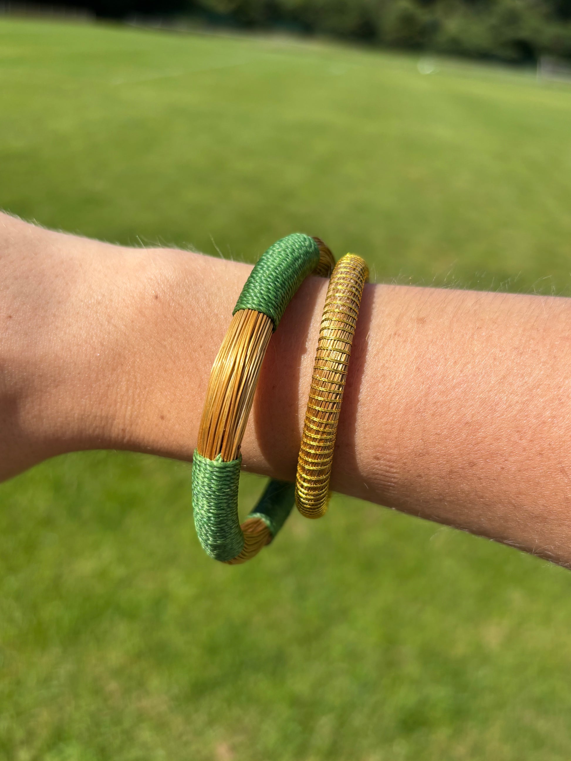 Mit seinem satten Grün erinnert der Folha Armreif an frisches Laub und Naturverbundenheit. Die Kombination aus Goldgras und grünem Garn verleiht dem Accessoire einen erdigen, ruhigen Charakter – perfekt für alle, die dezente Farben lieben.